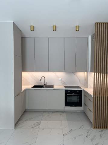Nowoczesna kuchnia w połączeniu bieli drewna i szarości