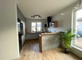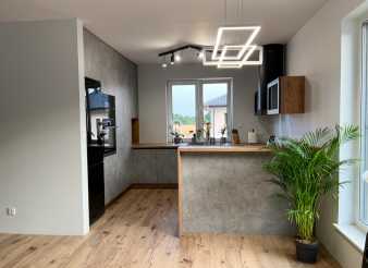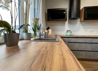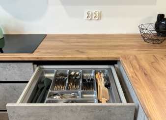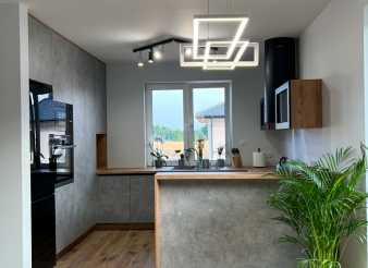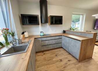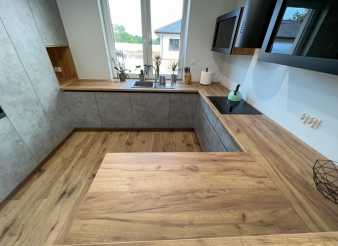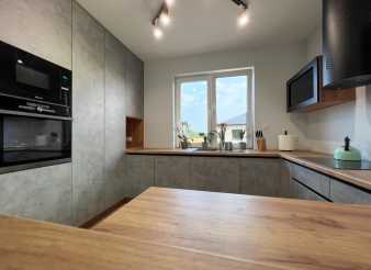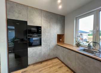 Nowoczesna aranżacja w połączeniu betonu i drewna. Fronty laminowane o dekorze Beton Chicago jasnoszary F186 ST9 firmy Egger idealnie dopełnia drewnopodobny blat dąb craft złoty. Odcienie betonu i drewna przełamują czarne matowe uchwyty typu korytkowego. Całość została wyposażona w zawiasy Blum, podnośniki Blum HKXS, szuflady Modernbox oraz nerkę FGV. Wykonana zabudowa kuchenna posiada wymiary 2,8 m x 3,5 m x 2,3 m oraz półwysep 1,5 m