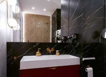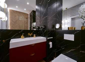 Głęboki burgund, szczotkowane złoto, czerń i marmurowe dekory Slim Line tworzą spójną i elegancką kompozycję. Projekt oparty został o materiały premium i akcesoria najwyższej klasy – wszystko po to, by stworzyć estetyczne i trwałe rozwiązania na lata.