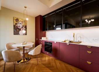 Zabudowa meblowa w kuchni została wykonana na wymiar, z zastosowaniem frontów akrylowych Brillant Noble Matt (Ground Chili) od REHAU, w modnym odcieniu burgundu. Górne szafki z czarnego szkła w aluminiowych ramach dodają elegancji i lekkości. Marmurowy blat Slim Line oraz płycina w tym samym dekorze (Carrara) podkreślają nowoczesny charakter zabudowy i dodają jej ponadczasowego wyrazu.