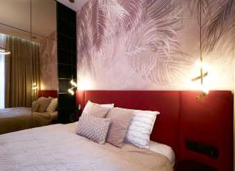 Miękkie tkaniny, burgundowy zagłówek i odbijające światło lustrzane fronty – wszystko to składa się na sypialnię zaprojektowaną z myślą o relaksie i wyrafinowanej estetyce. Widoczne elementy w czarnym macie i złote krawędziowe uchwyty HEXA podkreślają elegancki i nowoczesny charakter zabudowy.